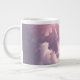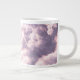 A solitary hot-air balloon floats through the pale pink canyon between towering clouds. The sun, low in the pastel sky, glows behind the edge of the billows, sending streams of bright light towards the viewer.