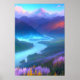 This stunning digital art piece offers a breathtaking view of a beautiful valley from the top of a hill. In the centre of the valley, a beautiful river winds its way through the landscape, partly covered in a thin blue mist that creates an ethereal and otherworldly atmosphere.