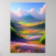 As you walk through the lush valley, your eyes feast on the colourful display that surrounds you. The ground is a carpet of red, pink, and yellow wildflowers, blending with the green grass that stretches as far as the eye can see. Above, the sky is a brilliant blue, the perfect canvas for the sun to paint its warm glow across the landscape. In the far distance, a towering mountain stands majestically, its snow-capped peak piercing the clouds. As you take in the stunning vista, you feel a sense of peace and awe at the beauty of nature.