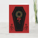 For your gothic holiday decor, this vampire themed design has a coffin with a festive Christmas wreath on it. Black and red colour scheme, holly leaves.
