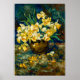 A vibrant bouquet of yellow daffodils fills a dark vase. The flowers are set against a swirling backdrop, enhancing their vivid colors.