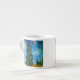 Espresso Cup featuring Vincent van Gogh’s oil painting Road with Cypress and Star (1890), also known as Country Road in Provence by Night. People walk along a road passing a beautiful cypress tree underneath a blue night sky with yellow moon and stars. A fantastic gift for fans of Post-Impressionism and Dutch art.