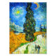 Photo Print featuring Vincent van Gogh’s oil painting Road with Cypress and Star (1890), also known as Country Road in Provence by Night. People walk along a road passing a beautiful cypress tree underneath a blue night sky with yellow moon and stars. A fantastic gift for fans of Post-Impressionism and Dutch art.