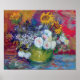 Oil on canvas from 1886 showing a bouquet of yellow sunflowers, white roses and other flowers in a green vase against a bright, multi-coloured background.
