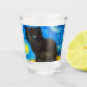 Shot Glass featuring a Van Gogh cat in the style of Starry Night! A fluffy black kitten perches on a table against a blue night sky and yellow moon. A purr-fect gift for cat lovers and Dutch art collectors!