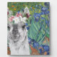 Beautiful and artistic compilation features Vincent Van Gogh's Irises fine art painting as a backdrop to an adorable watercolor llama with a fancy crown of flowers.