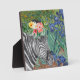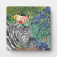 Beautiful and artistic compilation features Vincent Van Gogh's Irises fine art painting as a backdrop to an adorable watercolor zebra with a fancy crown of flowers.