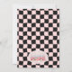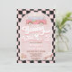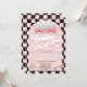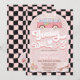 Retro style third birthday invitation for a girl featuring a van, daisies, skateboard, roller blades, wavy checkerboard and non editable retro style heading on a dusty pink arch.