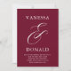 Modern wedding save the date card featuring a simple and minimal layout with your names and an elegant ampersand in a large format above your event details. The colour theme is burgundy and may be changed in the design editing tool.