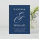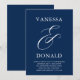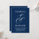 Modern wedding invitation featuring a simple and minimal layout with your names and an elegant ampersand in a large format above your event details. The colour theme is navy blue and may be changed in the design editing tool.