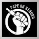 An encircled, stylised clenched fist holding a vaping mod, with the stenciled words "Vape On Strong" on the side. A message to fellow vapers who persevere and fight negativity with knowledge and information.