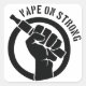 An encircled, stylised clenched fist holding a vaping mod, with the stenciled words "Vape On Strong" on the side. A message to fellow vapers who persevere and fight negativity with knowledge and information.