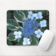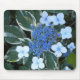 Photo of a beautiful variegated blue hydrangea bloom. Leaves are three different shades: white; grey/green; and green. Petals are formed in two ways: larger petals are white with blue centres and smaller, blue beads centre the larger, white petals.