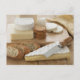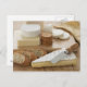 Various cheeses and bread on table postcard