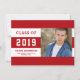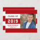 Traditional varsity lettering on striped background with single photo. Background can be changed to match your school colours. Easy and affordable do-it-yourself template. Add your own photos and custom text, or choose "Customise It" to change the layout, size, style or photo options. Optional stripes backer can be altered if you wish to add more photos, thank you message, or graduation party information.