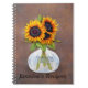 Personalised notebook with a vase of three beautiful sunflowers on a grungy, rustic brown background. Personalise with your own text, and use it for anything you choose.