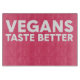 This graphic features bold, pink typography stating “VEGANS TASTE BETTER” prominently. The design employs a modern, eye-catching font that emphasizes the positive message about veganism. The bright colour scheme and strong text create an engaging visual, appealing to those who appreciate or promote plant-based lifestyles. This piece can serve as a slogan for a vegan campaign, restaurant, or awareness initiative