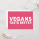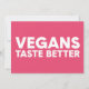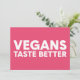 This graphic features bold, pink typography stating “VEGANS TASTE BETTER” prominently. The design employs a modern, eye-catching font that emphasizes the positive message about veganism. The bright colour scheme and strong text create an engaging visual, appealing to those who appreciate or promote plant-based lifestyles. This piece can serve as a slogan for a vegan campaign, restaurant, or awareness initiative