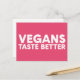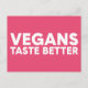 This graphic features bold, pink typography stating “VEGANS TASTE BETTER” prominently. The design employs a modern, eye-catching font that emphasizes the positive message about veganism. The bright colour scheme and strong text create an engaging visual, appealing to those who appreciate or promote plant-based lifestyles. This piece can serve as a slogan for a vegan campaign, restaurant, or awareness initiative