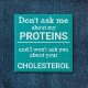 This minimalist fun button, featuring the wording "Don't ask me about my proteins and I won't ask you about your cholesterol" in white lettering on a light sea green background, is the perfect gift for every vegan.