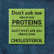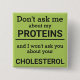 This minimalist fun button, featuring the wording "Don't ask me about my proteins and I won't ask you about your cholesterol" in black lettering on a light green background, is the perfect gift for every vegan.