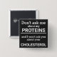 This minimalist fun button, featuring the wording "Don't ask me about my proteins and I won't ask you about your cholesterol" in white lettering on a black background, is the perfect gift for every vegan.