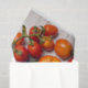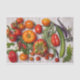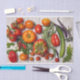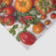 Top view of an organically homegrown vegetable and herb harvest, including tomatoes, cucumbers, beans, hot peppers, basil, sage and oregano
