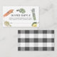 This cute "locally grown baby" gender-neutral farmer's market baby shower diaper raffle ticket enclosure card features a white background with vegetables and fruits in watercolor. The reverse side features a white background with black buffalo/gingham check patterns. Personalise for your needs. You can find matching products at my store.
