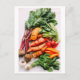 This postcard features a photo of vegetables, including carrots, beets, radishes, and garlic.