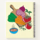 A notebook to gather your favourite family recipes . The cover is yellow with a some vegetables (a red onion , some carrots and tomatoes) and some herbs (basil and parsley) on a cutting board . In the fore front there is also a blue bowl with some steaming homemade soup . Would be great to hand out at a family reunion :)