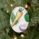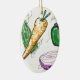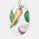A group of four vegetables in a seamless pattern that includes an red onion, green pepper, stalk of celery and a carrot.