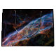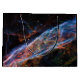 In the Veil Nebula, the ghosts of a colossal stellar explosion linger. Threads of glowing red hydrogen weave through the nebula, energised by the fading shockwave. Pockets of blue oxygen gas and wisps of green nitrogen gas add an eerie beauty to the celestial tapestry. This hauntingly colourful image captures the Veil Nebula's transformation from a massive star to the raw materials for future star systems. - This file is in the public domain in the United States because it was solely created by NASA.