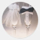 The sticker is made on wonderful paper and had no problem sticking to the bag that I purchased to put it on. I wanted to find a design that would be cute for the bride and groom and this one fit the bill as it has cute "bees" buzzing around and the wedding was taking place in a town called "Bee Cave". The packaging was great and protected the stickers. The website is easy to navigate and there are so many color choices. I had no problem finding a color that the bride was using on everything else selected. The design was adorable and there were many to choose from. You can make the figure as larger or smaller and you can place the photo and writting whereever you want to in the sticker. The printing is fabulous..better than expected.