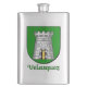 Hispanic surname Velasquez heraldic shield drinking flask. Text below the shield is in a classical style font to match the colours on the shield.