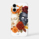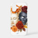 A striking artistic case featuring two contrasting Venetian-style masks — one ivory, one charcoal — surrounded by deep red and orange roses, symbolising duality and mystery. Finished with an elegant monogram for a refined touch.