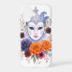 A striking artistic case featuring two contrasting Venetian-style masks — one ivory, one charcoal — surrounded by deep red and orange roses, symbolising duality and mystery. Finished with an elegant monogram for a refined touch.