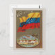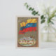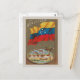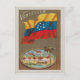 Vintage Venezuela card from a late 1800s colour lithograph shows a Venezuela flag with yellow, blue, and red stripes and white circcle of stars, along with a vignette illustration of buildings, a palm tree, and a farmer with animals pulling a cart.