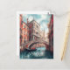A romantic postcard illustration of Venice, showcasing a graceful gondola gliding beneath an arched stone bridge. The scene is framed by historic Venetian palaces with weathered red façades, ornate balconies, and Gothic windows. Soft sunlight reflects on the shimmering turquoise canal, while the distant bell tower rises against a sky of drifting clouds. This dreamy artwork beautifully captures the timeless charm and elegance of Venice’s canals. You can customise the text.