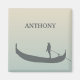 Create a small personalised gift with a Venetian style. This refrigerator magnet has a silhouette style illustration of a gondolier and a gondola in grey set against a sunset coloured background of light golden yellow and light blue. Grey lettering is ready to be personalised with a name or other text.