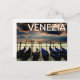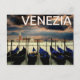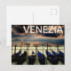 A beautiful travel postcard from Venice, Italy, with a line of gondolas in the front, the Grand Canal in the back, and Venezia written across the sky. Great for vacations and tourists in Venice.