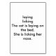 These custom flashcards feature the verbs laying and licking. Pictured is a cat laying on a bed, while she is licking her nose. The text on the back says,