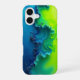 A vibrant and abstract digital art piece that depicts a dynamic, jagged fissure dividing a smooth surface. On one side, the surface is a bright, luminous lime green, while the other side transitions from deep blue to a lighter cyan. The central fissure is filled with a textured, swirling pattern of rich blues and greens, giving the impression of a deep, watery chasm with organic, rock-like edges. The overall effect is a striking contrast of colours and textures.