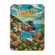 A captivating and nostalgic depiction of Vernazza, one of the picturesque villages in Italy's Cinque Terre. The design captures the vibrant pastel-coloured houses clinging to the cliffs, the charming harbour filled with fishing boats, and the rugged coastline meeting the azure waters of the Mediterranean Sea. Rendered in a vintage style, the artwork evokes the enchanting beauty and timeless charm of Vernazza, inviting viewers to explore its scenic vistas and cultural richness.