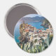 Round photo magnet with the colourful houses of the small fishing town Vernazza, one of the Cinque Terre villages, built on a rock at the Mediterranean coast of Liguria, near La Spezia in Italy.