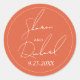 Whimsical modern script calligraphy Verona sunset orange minimalist fall wedding Classic Round Sticker. This Classic Round Sticker features a truly elegant design, perfect for adding a sophisticated touch to your wedding stationery or favours. The minimalist aesthetic is achieved through a beautiful orange background, upon which the couple's names are delicately showcased using a whimsical modern script calligraphy in crisp white.