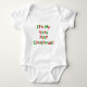 Red and green kid style text reads "It's My Very First Christmas!" on holiday tote bags, bodysuits, and Tshirts for babies who are celebrating their very first Christmas!
