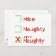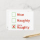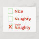 Three green check boxes with the words Nice, Naughty and Very Naughty in red text next to them, the box for Very Naughty has been checked with an "X" oops sorry Santa!