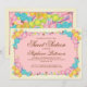 It will certainly be a VERY sweet sixteenth birthday party celebration with this original design made for a sixteenth birthday party, but is perfect for any celebration or a candy-themed party. An explosion of colourful treats in pink, aqua, yellow and green on a background of pastel pink is decorating both the front and back of the invitation and gives the illusion of spilling from a box of candies. So yummy looking!
