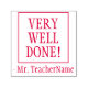 This inspirational rubber stamp design features the message "VERY WELL DONE!" and a custom teacher's or educator's name. It could be used by a teacher or educator when marking assignments, to acknowledge that the student has done well.
