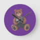Adorable hand drawn teddy bear wearing a vest and bowtie, suit and holding flowers decorates this cute clock for kids or the young at heart